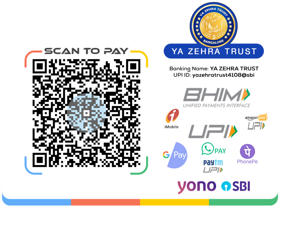 We request our brothers & sisters in faith to Leave a legacy & obtain the Greatest Sawab-E-Jariya in the name of the donor, your loved ones, or Esal-E-Sawab to the deceased Mother, father, Grandpa, Grandma etc. Kindly send your contribution/ Hadiya/ Sadqa/ Kaffara in favour of Ya Zehra Trust by cheque, Draft, Bank Transfer, Google pay, or Paytm.